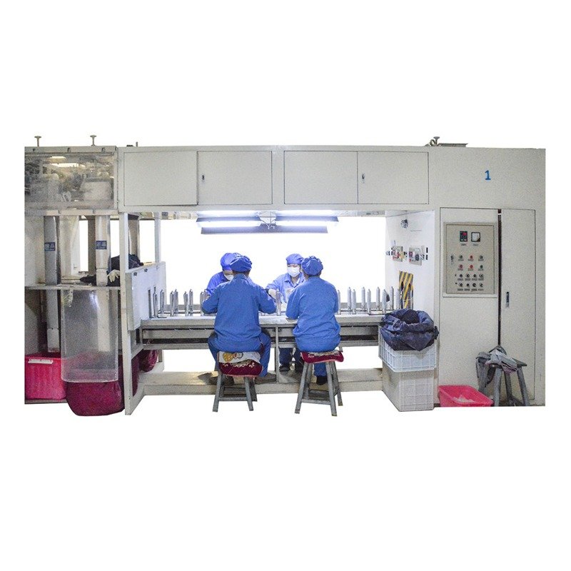 This is the most important step in condom molding.The glass mold is repeatedly dipping in latex three times.—condom dipping line.